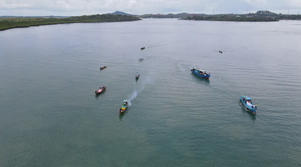 Puluhan warga Bintan Pesisir menggelar aksi di laut dengan pawai kapal menuju kawasan pembangunan Kawasan Industri (KI) Pulau Poto hingga perairan depan PT Bintan Alumina Indonesia (BAI), Rabu (22/4/2026).
